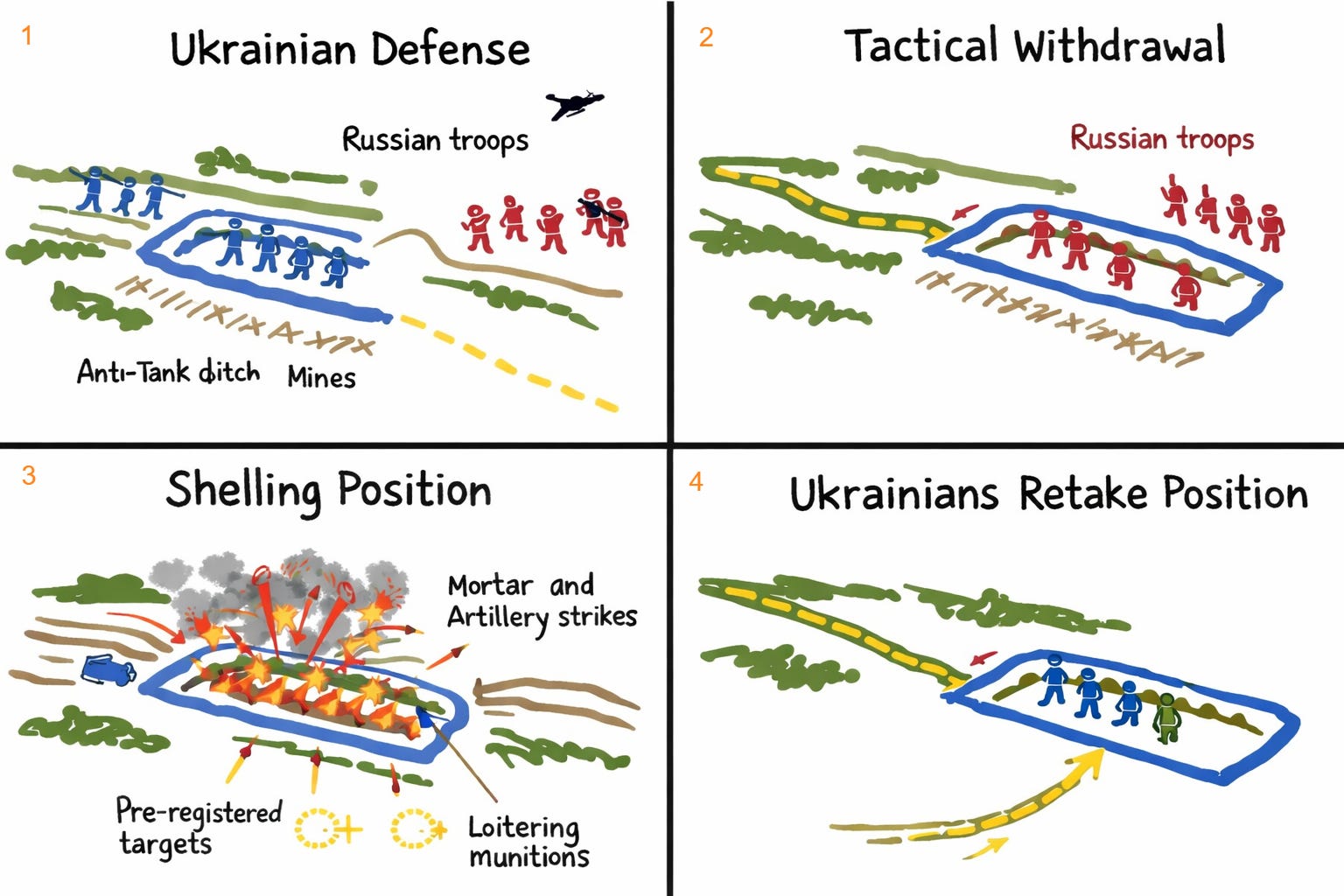 Ukrainian infantry then reoccupies the position, restores the obstacle coverage, and resets the kill zone for the next assault cycle.