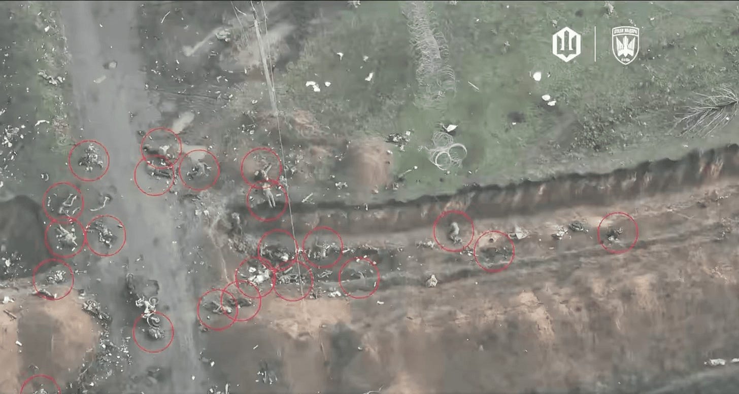 If Russian troops believe that every advance ends with them getting hunted in place by drones and artillery, they either stop advancing or they advance like men walking to a funeral they can already hear.
